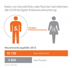 Bei Männern stellte Krebs der Mundhöhle und des Rachens 2012 die fünfthäufigste, bei Frauen die 15-häufigste Krebsneuerkrankung dar.